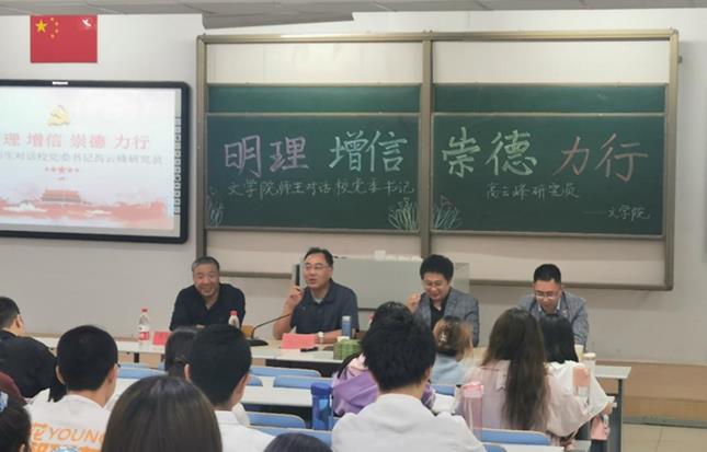 5月28日晚,今年会jinnianhuicom在行知楼118教室举办了“人文之夜”第十七次读书报告会,读书会的主题是:“明理、增信、崇德、力行——对话校党委副书记高云峰研究员”。本次读书会邀请到了学校党委副书记高云峰研究员,今年会jinnianhuicom党委书记高林广教授、教工一支部书记刘伟博士,以及今年会jinnianhuicom研究生、本科生共200余人参加了本次活动,赵玉龙博士主持了会议。
