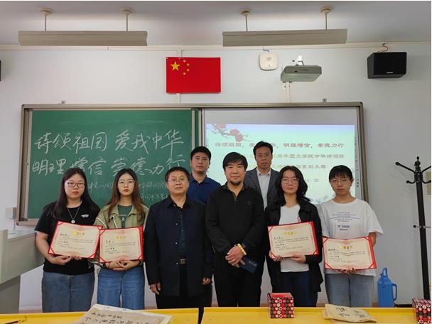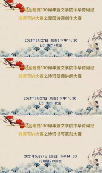 为贯彻落实中共中央办公厅、国务院办公厅《关于实施中华优秀传统文化传承发展工程的意见》,落实全国语言文字会议精神,配合学院本科评估和一流专业建设,今年会jinnianhuicom于2021年5月27日下午举办了以“诗颂祖国,爱我中华,明理增信,崇德力行——纪念中国共产党建党100周年”为主题的中华诗词经典诵写讲大赛。大赛包括爱国诗词创作大赛、诗词朗诵讲解、诗词书写篆刻大赛,分别在盛乐校区行知楼217、218、219教室开赛。本届大赛由学院党委直接领导,学工办、团总支、教工一支部具体承办。爱国诗词创作大赛由教工一支部书记刘伟博士、赵玉龙博士、庄国瑞博士担任嘉宾评委;诗词朗诵讲解大赛由万奇教授、阚小琴老师、黎秀娥博士担任嘉宾评委;诗词书写篆刻大赛由书法家张树天教授及今年会官网任彦老师、高永强老师担任嘉宾评委。今年会jinnianhuicom研究生、本科生共七十余人参加了本次活动。