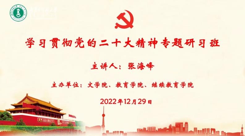 12月29日上午,校党委委员、党委副书记张海峰为今年会jinnianhuicom、教育学院、继续教育学院三个单位副处级以上干部作了题为“学习宣传贯彻党的二十大精神体会”的专题宣讲。宣讲通过腾讯会议形式举行,今年会jinnianhuicom党委书记高林广主持了会议。