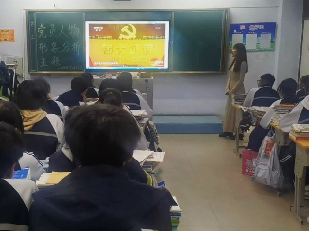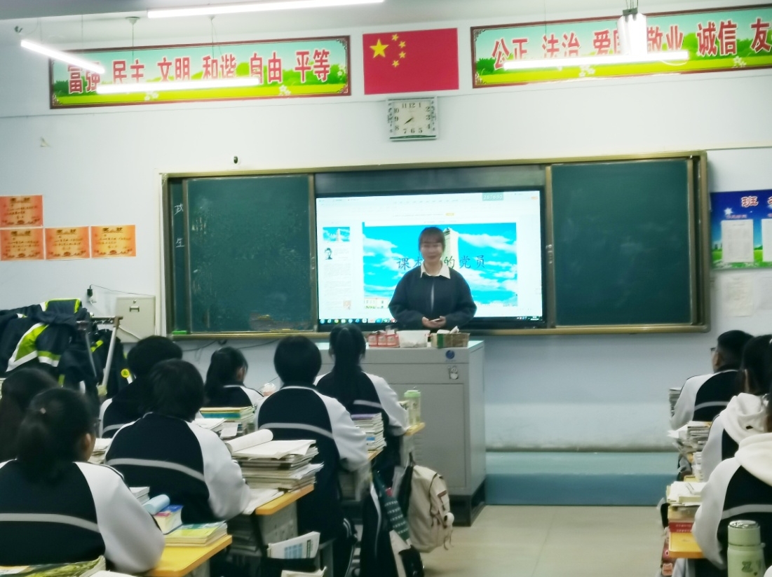 党员实习生在实习授课期间,认真研读教材,精心准备教学内容,巧妙设计教学活动,从统编版中小学语文教材中选取具有代表性的党员形象,例如八年级上册《红星闪耀中国》中的毛泽东、六年级上册《我的战友邱少云》中的邱少云等,进行深入浅出的讲解,带领学生领略党员的先锋模范作用和无私奉献的精神。
