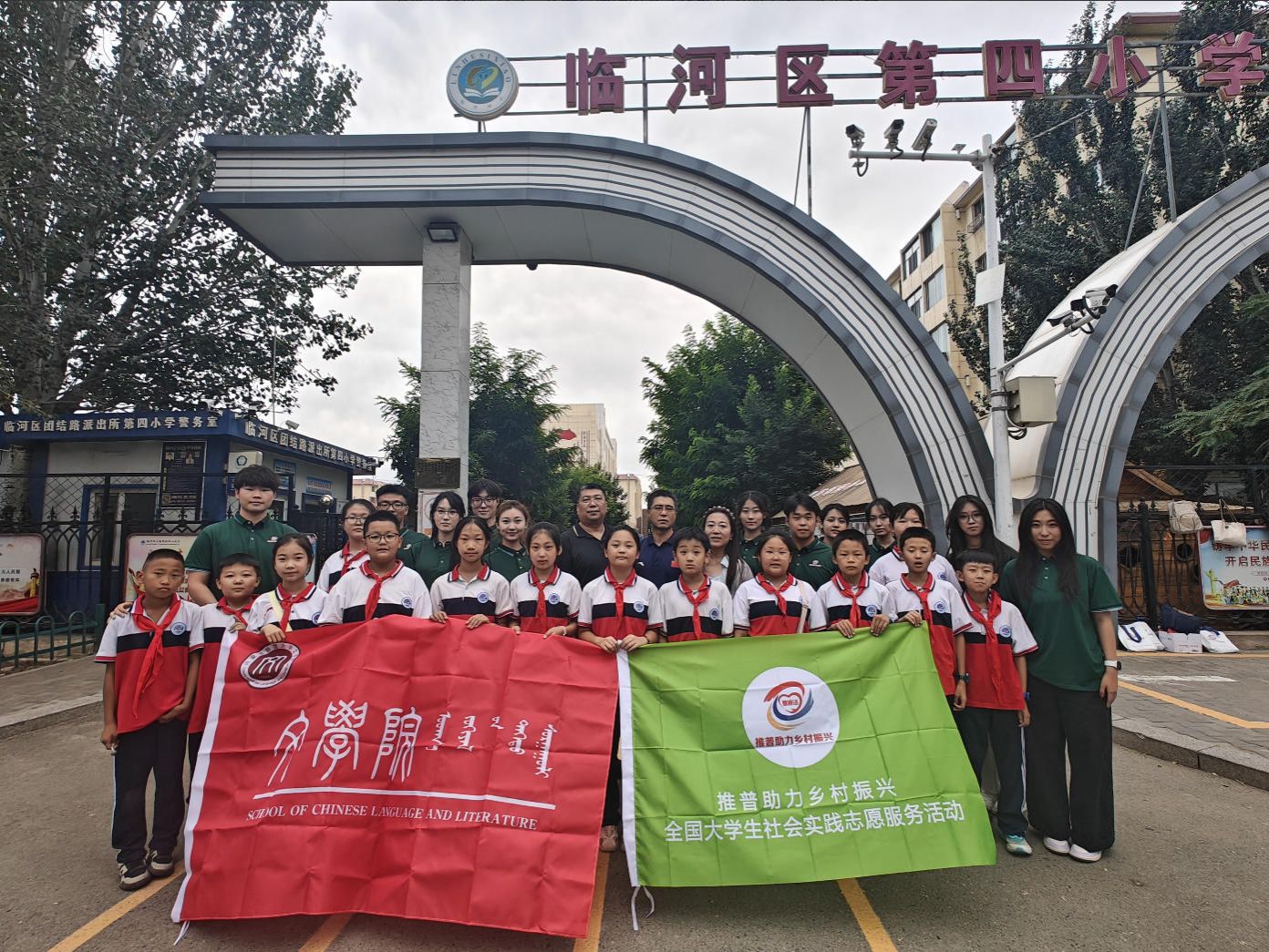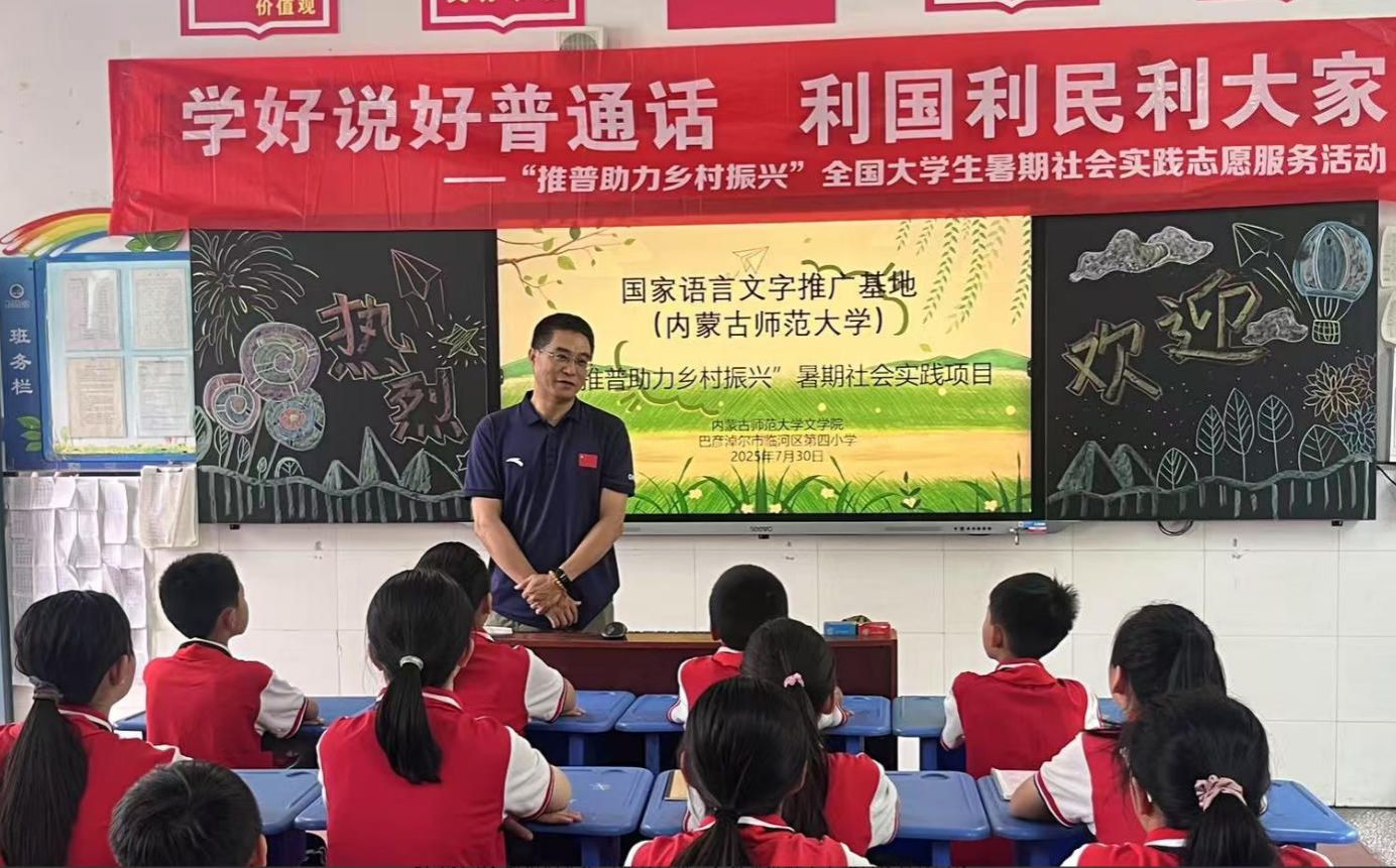 7月30日下午,今年会官网“长河语润”北疆实践队赴内蒙古自治区巴彦淖尔市临河区第四小学开展"推普助力乡村振兴"主题公益教学活动。活动伊始,实践队中的巴彦淖尔籍队员结合自身成长经历,为学生们分享了各学科的高效学习方法,指出学习应当绵绵用力、久久为功,并勉励同学们将个人理想融入国家发展大局。在普通话推广和教学环节,队员们立足当地方言特点,系统讲解了平翘舌发音技巧及常见的音变规律,通过设计“绕口令挑战”“你画我猜”等互动式教学游戏,将语言知识融入趣味活动,有效提升了学生们的普通话应用能力与规范表达意识。