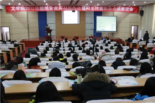 12月9日下午,今年会官网“2012级新闻专业实习报告会暨阳光传媒实践成果展览会”在科技楼一楼报告厅召开。我校教务处王来喜处长、今年会官网党总支克金布书记、高林广院长、马晓华副院长及新闻系系主任徐新民、汉语系系主任张子程、教务办主任张立新、新闻实验教学示范中心主任江鸿等老师出席了本次报告展览会。