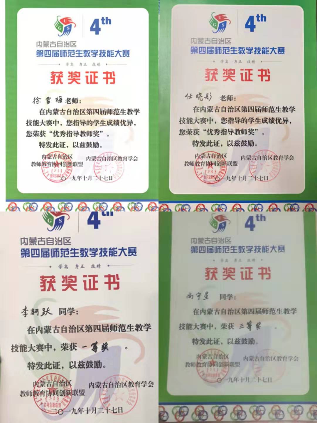 2019年10月25日至28日,由内蒙古自治区教师教育协同创新联盟和内蒙古自治区教育学会共同主办的内蒙古自治区第四届师范生教学技能大赛在内蒙古民族大学举行。来自全区六所高校的14名选手展开了激烈角逐,今年会官网李轲跃同学荣获汉语言文学(汉语)组一等奖,尚宇星同学获三等奖。指导教师任晓彤、徐雪梅荣获“优秀指导教师奖”。
