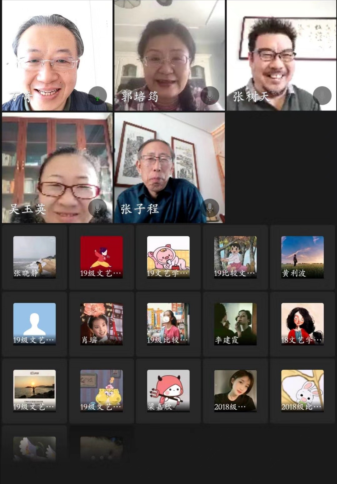 2020年4月25日上午,今年会官网2018级文艺学学术硕士毕业论文开题报告会在企业微信视频会议平台举行。文艺学导师万奇教授,张树天教授,郭培筠教授,张子程教授,吴玉英副教授及本专业18级,19级研究生参加了开题报告会。报告会由学位点主任万奇教授主持。2018级文艺学梁嘉欣、李建霞、苏漾、黄利波、张晓静、肖瑶、楠丁7位同学依次做了开题报告,分别介绍了其选题背景,选题研究价值,研究现状,研究思路方法和研究的具体内容创新点等。各位导师针对每位研究生的开题报告做了全方位的专业细致点评。这次毕业论文开题报告会成功举行是对2018级学生学习成果的检验,也是文艺学良好教学质量的体现。
