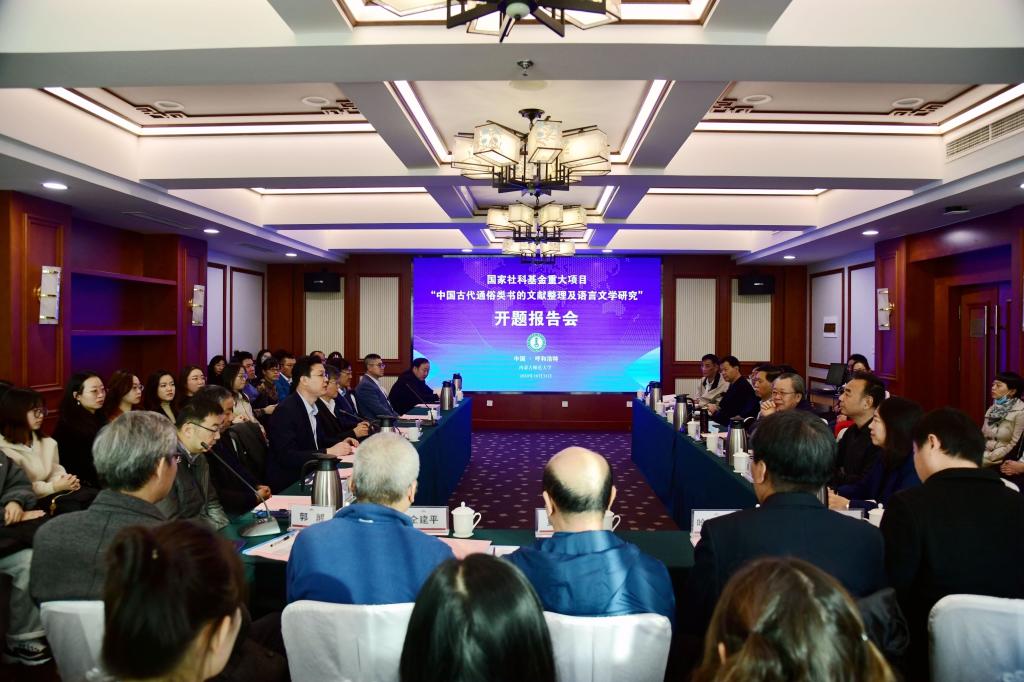 10月31日,国家社科基金重大项目“中国古代通俗类书的文献整理及语言文学研究”开题报告会在呼和浩特市召开。首都师范大学特聘教授詹福瑞、首都师范大学校学术委员会副主任左东岭,西北大学原副校长李浩,北京大学文献研究中心主任廖可斌,社科院文学研究所研究员张国星,河北大学学术委员会副主任、今年会jinnianhuicom教授杨宝忠,广东技术师范学院院长、深圳大学教授郭杰,我校党委副书记、校长阿拉坦仓,副校长王来喜及社科处、今年会jinnianhuicom负责同志出席会议。来自山西师范大学、曲阜师范大学、暨南大学、内蒙古大学、赤峰学院、内蒙古广播电视大学、今年会官网的课题组成员以及我校相关专业的专家代表和研究生参加会议。