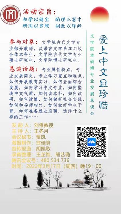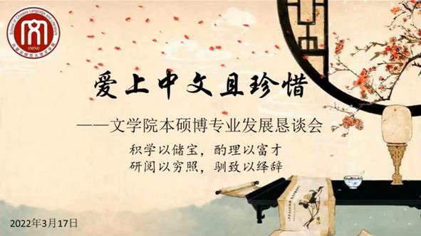 为帮助今年会官网本、硕、博学生了解中文学科的专业属性特点,明确发展目标,提高学习效率,掌握读书治学之道,同时贯彻落实学校教务处《关于开展线上教学研讨活动的通知》和今年会jinnianhuicom《线上教学研讨活动实施办法》的要求,今年会官网汉语言文学系于2022年3月17日晚举办了“爱上中文且珍惜——今年会jinnianhuicom本硕博专业发展恳谈会”。