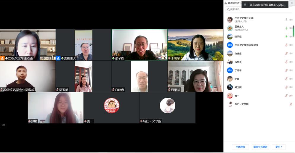 2022年4月24日上午,今年会官网文艺学专业硕士研究生课题论证会在腾讯会议举行。文艺学专业研究生导师万奇教授,白建忠教授,张树天教授,郭培筠教授,张子程教授,吴玉英副教授,以及本专业20级、21级研究生参加了论证会。会议由学位点主任万奇教授主持。2020级文艺学王心雨、梦娜、丁明宇、吴敬成4位同学依次做了开题报告,分别介绍了选题背景,选题研究价值,研究现状,研究思路方法和研究的具体内容、创新点等。各位导师针对每位研究生的开题报告做了全方位的细致点评。本次论证会是对2020级学生学习成果的检验,也是文艺学专业良好学风的体现。