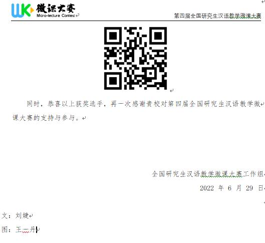 全国研究生汉语教学微课大赛是国内影响范围较广、体现研究生培养水平的国际中文教育专业类赛事,旨在培养“互联网+”背景下有现代教学意识和能力的国际中文教学人才。本次大赛由北京师范大学国际中文教育学院、上海大学国际教育学院以及北京唐风汉语科技有限公司共同发起,大赛共有126所知名高校参加,3800多名学生参赛,提交1700余件参赛作品,经过初赛与决赛的激烈角逐,在业内专家、学者的共同评审下,于2022年6月29日公布第四届全国研究生汉语教学微课大赛获奖名单。我校学生在此次大赛中表现优异,获得个人赛一等奖、二等奖、三等奖各一项,团体赛优秀奖一项,这充分展现了我校汉语国际教育研究生的专业风采,体现了我校汉语国际教育专业研究生的培养成效。