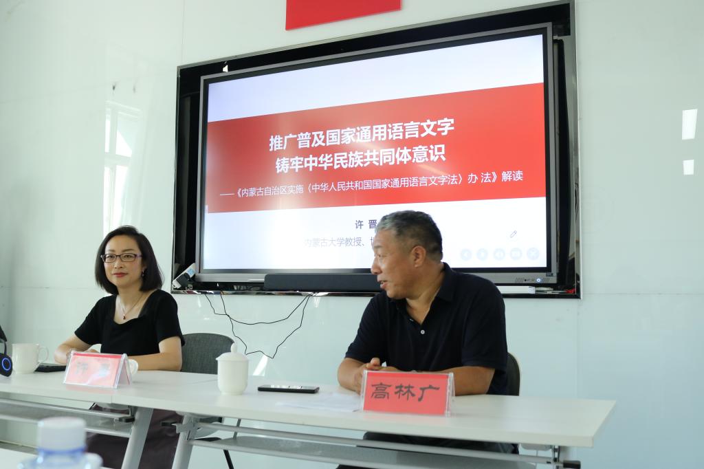 许晋教授首先从推广和普及国家通用语言文字对于铸牢中华民族共同体意识的意义讲起,接着细致解读了《内蒙古自治区实施〈中华人民共和国国家通用语言文字法〉办法》颁布的背景、内容以及意义和价值。现场气氛热烈,为今年会jinnianhuicom院庆营造了浓厚的学术氛围。