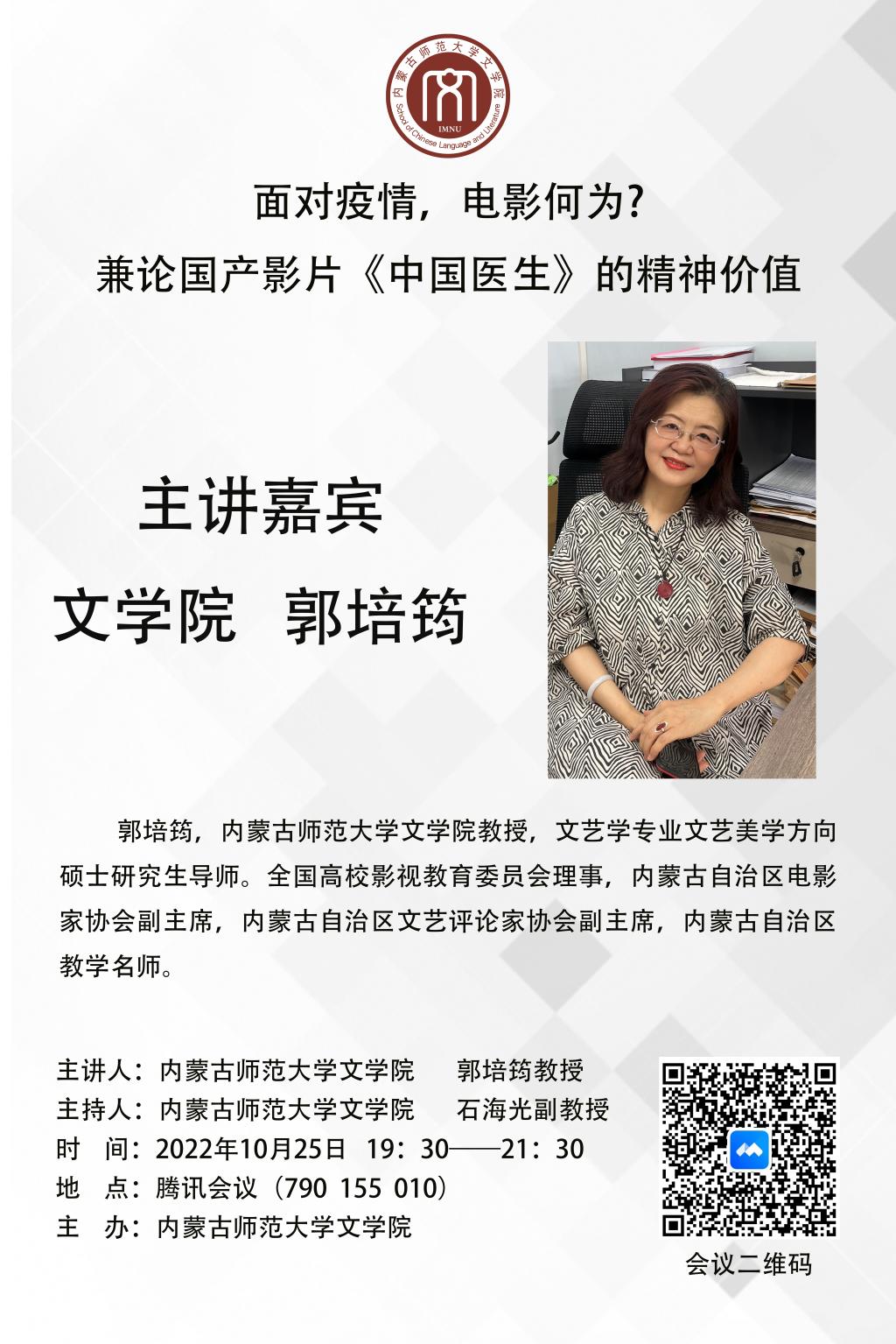 2022年10月25日,今年会jinnianhuicom结合当前抗疫形势,组织了抗疫专题特别教研活动,由郭培筠教授做了题为《面对疫情,电影何为?——兼论国产影片<中国医生>的精神价值》的专场讲座。