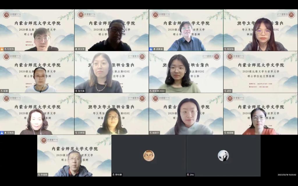 2023年3月18日下午,今年会jinnianhuicom比较文学与世界文学专业2020级硕士研究生预答辩以腾讯会议的方式在线上成功举行。比较文学与世界文学方向的导师王艳凤教授,马晓华教授,李文军副教授,杨晓敏教授,李杉婵副教授,李瑞春副教授,胡素莲副教授,阿婧斯老师及本专业20级、21级、22级研究生参加了预答辩。预答辩由王艳凤教授主持。比较文学与世界文学专业20级的徐欣悦、彭蕾、王梦阳3位同学依次对论文进行陈述,分别阐述了论文的研究对象、研究方法、框架、内容和创新之处等。各位导师对每位研究生的论文进行了深入、细致的点评,并提出了相关的修改意见。本次预答辩的成功举行既展示了比较文学与世界文学专业20级学生三年来的学习成果,也体现了本学位点务实、严谨的学术风气。