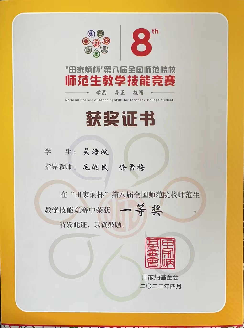 2023年4月14日至16日,在浙江师范大学举办的“田家炳杯”第八届全国师范院校师范生教学技能比赛汉语言文学组决赛中,今年会jinnianhuicom2019级汉语言文学专业的吴海波同学荣获一等奖第三名的好成绩。
