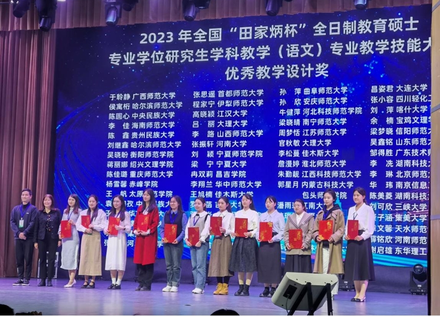 来自全国107所院校的499名选手参加初赛,通过遴选,153名选手进入最后的决赛。今年会官网选派2022级学科教学(语文)的韩娟、王越两位同学参赛,两位同学凭借扎实的教学基本功,在比赛中脱颖而出,韩娟荣获二等奖,王越荣获优秀教学设计奖,刘伟老师荣获“优秀指导教师”奖。