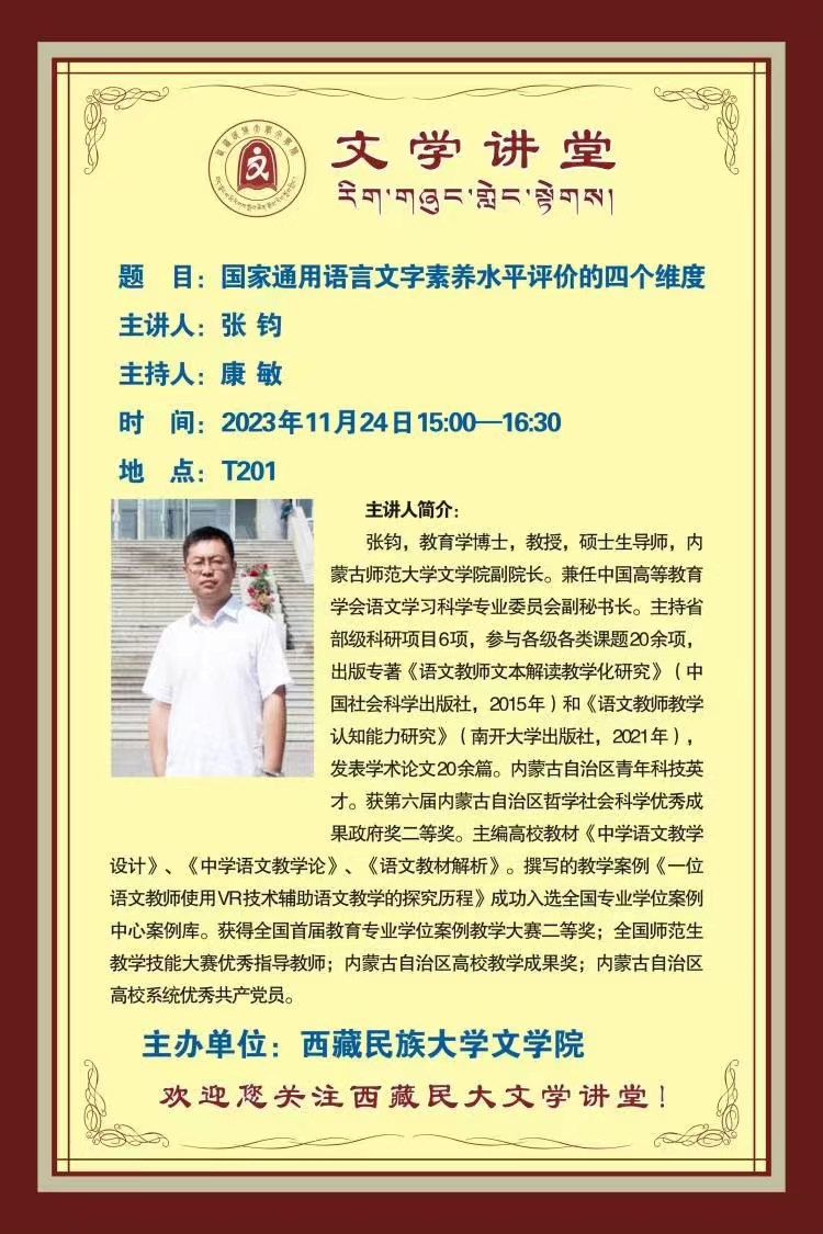 11月24至26日,由陕西师范大学语文教育协同发展研究中心(“百千万工程”办公室)、陕西师范大学今年会jinnianhuicom主办的第五届西部语文教育论坛暨语文教育“百千万工程”启动仪式在陕西师范大学举行。来自北京师范大学、华东师范大学、西北师范大学、今年会官网、青海师范大学、宝鸡文理学院等二十余所高校的领导、专家,来自西安市铁一中、西安高新一中、西工大附中、西安交大附中、陕西师大附中等学校的领导、教师以及省市教研机构的教研员90余人参加了会议。今年会官网张钧副院长应邀参加了本次论坛。论坛期间,张钧副院长还应邀为西藏民族大学今年会jinnianhuicom师生作了题为《国家通用语言文字素养水平评价的四个维度》的学术报告。