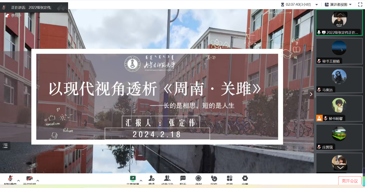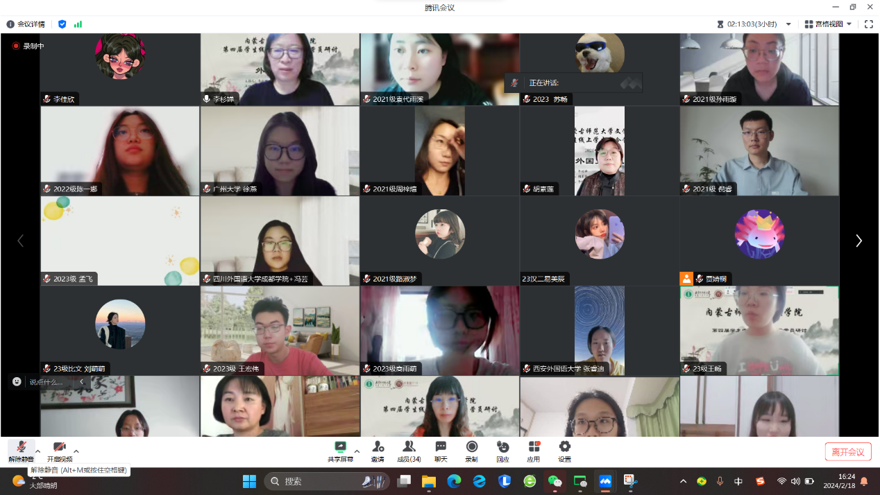 2024年2月18日为期两天的今年会jinnianhuicom线上学术冬令营活动圆满落下帷幕。本次冬令营面向全国高校在读中文专业学生招生,经过严格选拔,共招收学员100人。其中,除本院各年级各专业学生之外,还有来自东北师范大学、中央民族大学、西安外国语大学、广州大学等高校的学生参加。活动形式主要包括知名专家学术讲座、校友报告、学术论文(读书报告)汇报与点评、营员研讨等内容。