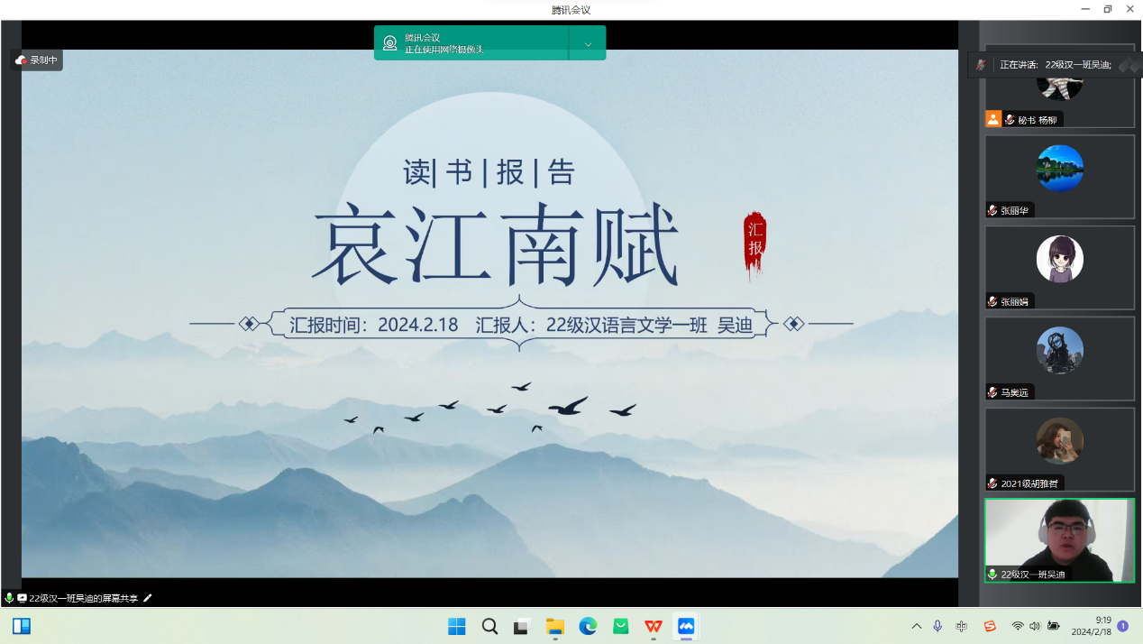 2月18日的活动主要为学术论文(读书报告)的汇报与点评及营员研讨。活动按学科分为四组,分别是中国古代文学组、中国现当代文学组、外国文学组和语言学、文字学组,共57名学生做了线上汇报。今年会官网教师李杉婵、孙静、马奥远、刘婕分别担任各学科组长,组织了各组的论文(读书报告)汇报评议与营员研讨活动。