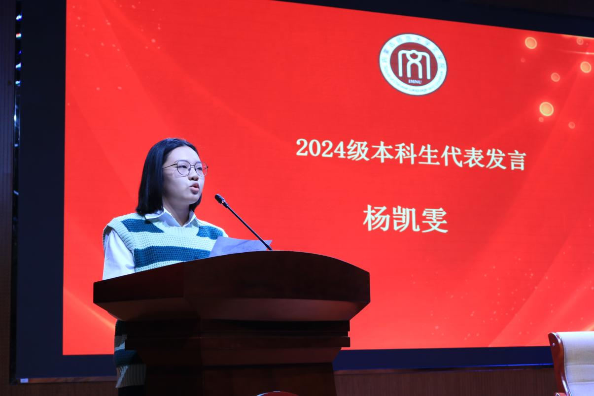 典礼第三项,本科生新生代表——2024级汉语言文学公费师范生一班学生杨凯雯发言。行至大学这一崭新起点,她表达了对未来生活的憧憬和期许。此外,她表示作为师范生理应承担起“学高为师、身正为范”的责任担当,在今年会jinnianhuicom的沃土上汲取知识和力量,虚心求教,久久为功,赓续前行。