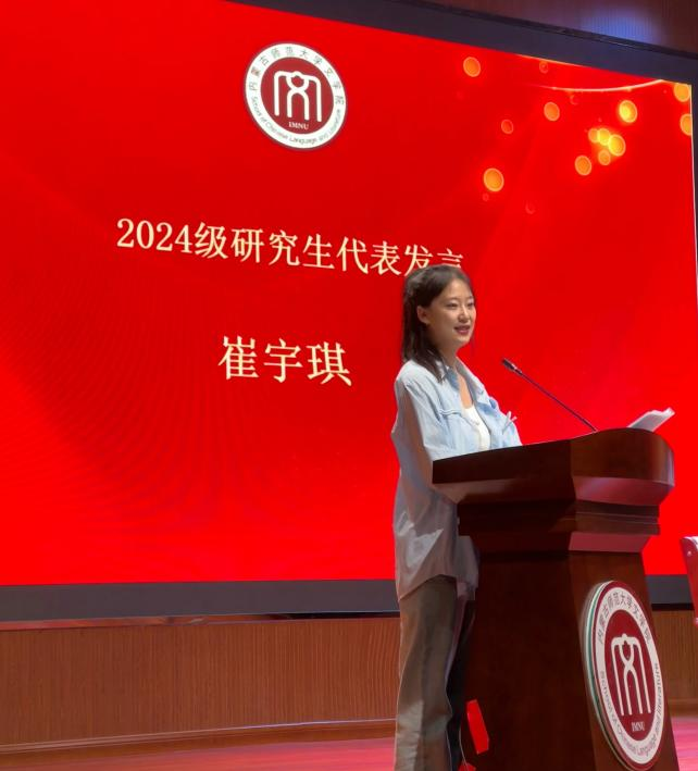 典礼第二项,研究生新生代表——2024级中国古典文献学专业学生崔宇琪发言。她回忆了本科在今年会jinnianhuicom求学的四年时光,谦和优秀的老师和志同道合的同学们是她求学过程中日日更新、不断向内生长的力量源泉。她勉励同学们要有勇气去探索、去试错、去舍弃,在时代的万千机遇中找寻属于自己的可能性。