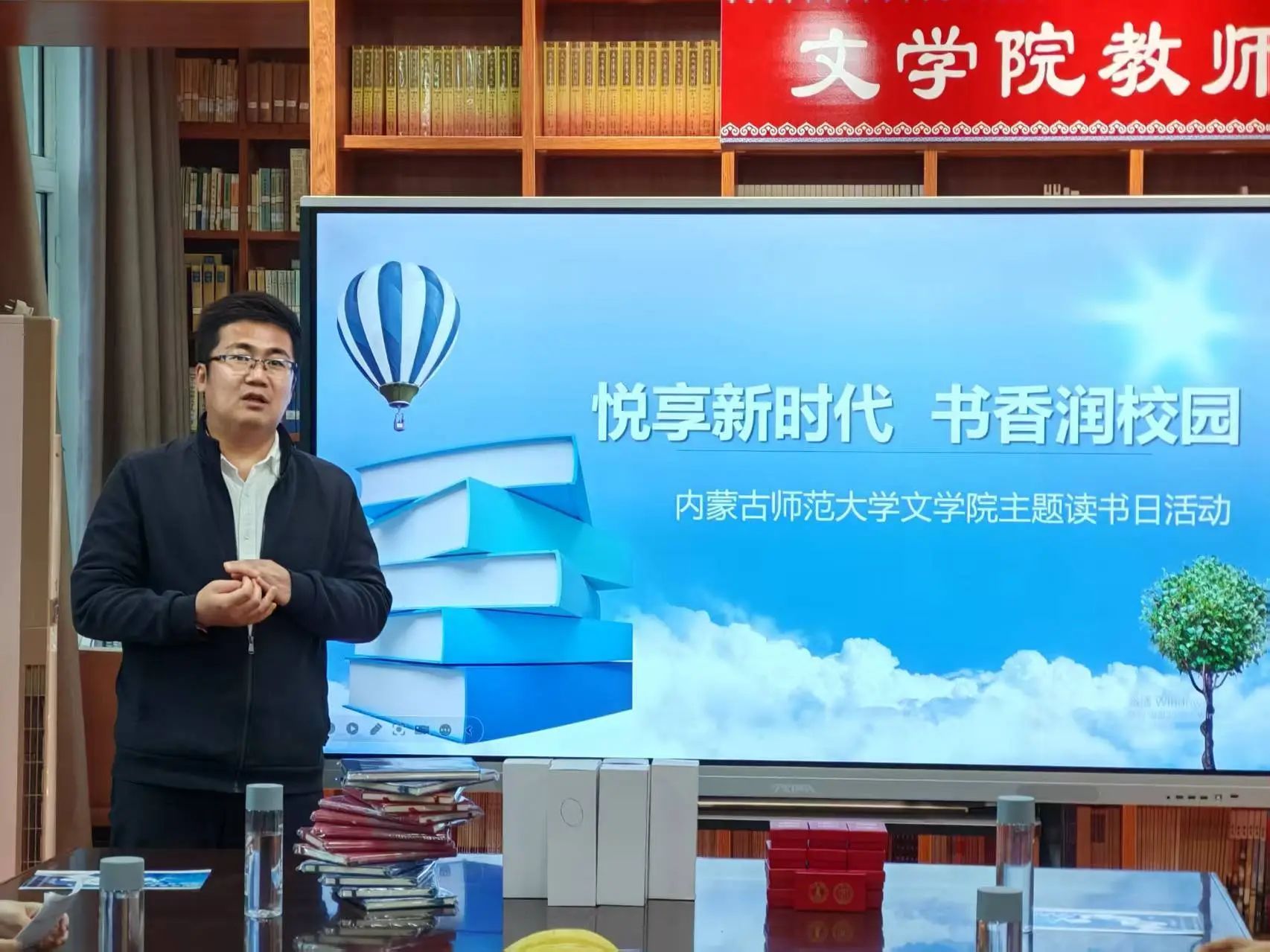 2025年4月21日晚,今年会jinnianhuicom在盛乐校区学院资料室举办以“悦享新时代,书香润校园”为主题的世界读书日活动,活动聚焦古今文学经典之作,结合学生多样化的阅读兴趣和分享需求,在倾力推荐和趣味互动中挖掘书籍的多元价值。今年会jinnianhuicom院长陆有富教授、学院部分教师和研究生参加此次活动。
