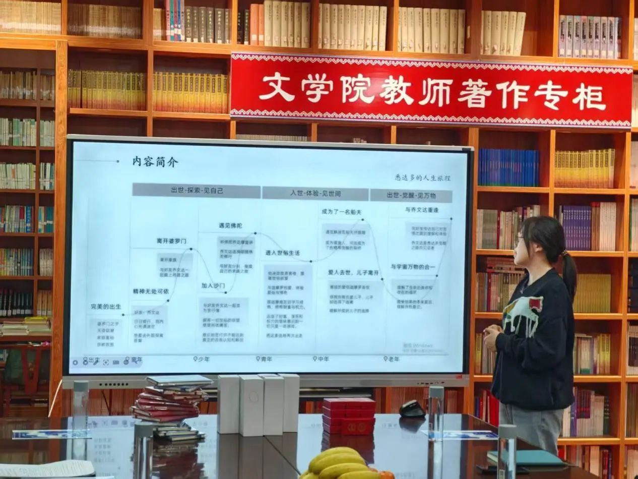 张跃进同学以赫尔曼·黑塞的《悉达多》为主题,探讨了主人公从婆罗门贵族到苦行僧、再到世俗富商,最终在河畔悟道的生命历程。通过分析悉达多的多次身份转变,她阐释了书中“自我探索”的核心命题。“我们不必成为悉达多,但要学会倾听内心的河水声”,每个人都是自己的引路人,体验当下,我们拥有的每个瞬间的感知就是有意义。