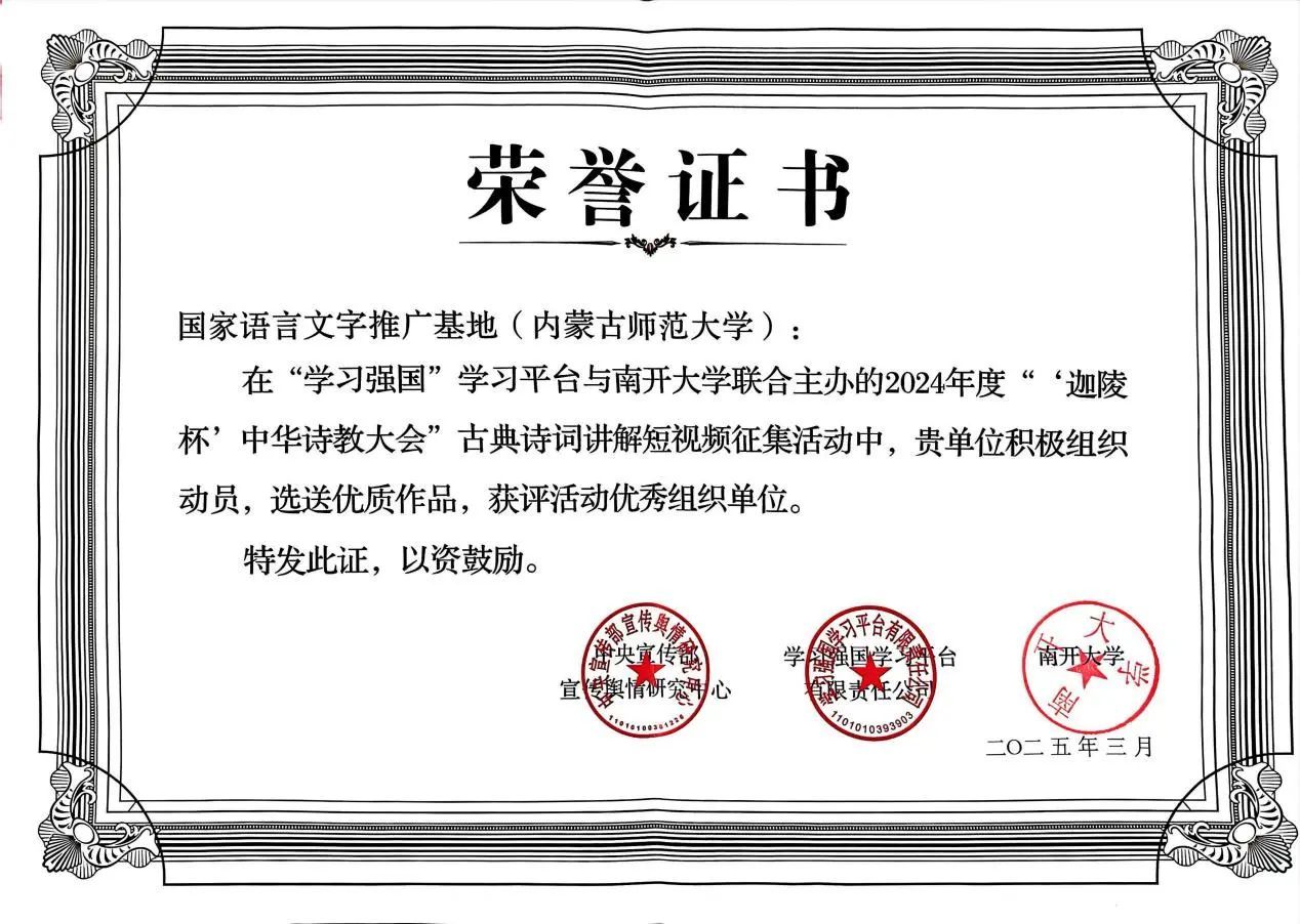 6月25日,首届“迦陵杯•中华诗教大会”在浙江杭州盛大启幕。中宣部宣传舆情研究中心、“学习强国”学习平台、南开大学共同授予国家语言文字推广基地(今年会官网)2024年度“‘迦陵杯’中华诗教大会”优秀组织单位,以表彰国家语言文字推广基地(今年会官网)在中华诗教传承推广中取得的突出成绩。
