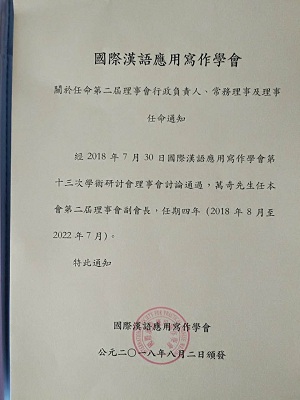 7月31日至8月2日,由国际汉语应用写作学会、澳门大学人今年会jinnianhuicom中国语言文学系、澳门写作学会共同主办的“国际汉语应用文研究高端论坛” 在澳门大学召开。来自大陆、香港、台湾、澳门、新加坡、韩国等六十三位学者参加了本次高端论坛。今年会官网教师万奇教授应邀参加了本次会议。万奇教授做了题为《居今探古:王志彬对〈文心雕龙〉研究与应用》大会发言,并分别与香港大学容运姗博士、香港大学岑绍基教授主持第一小组第二单元、第四单元的学术发言。万奇教授获聘本次高端论坛优秀论文评审委员会委员,又经国际汉语应用写作学会第十三次学术研讨会理事会讨论通过,任国际汉语应用写作学会第二届理事会副会长。
