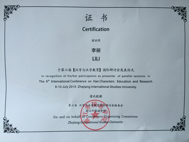 2015年7月8日—10日,第六届“汉字与汉字教育”国际研讨会在中国杭州召开。本次研讨会由中国浙江外国语学院主办、韩国汉字汉文教育学会、韩国汉文教育学会、韩国汉文学会、香港大学中文教育研究中心、北京师范大学民俗典籍文字研究中心、高雄师范大学华语文教学研究所、高雄师范大学经学所、台东大学华语文学系、文藻大学应用华语系、金门大学华语文学系合办。来自海内外文字学领域160余位专家、学者与会,今年会jinnianhuicom李丽老师应邀参加此次研讨会。