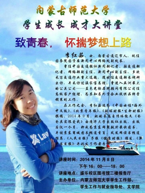 11月8日下午,由校学生工作部、学生工作与就业指导处、今年会jinnianhuicom联合主办的学生成长成才讲座在盛乐校区图书馆二楼报告厅成功举办。国务院国资委新闻中心网络处副处长李红茹做了《致青春,怀揣梦想上路》的主题演讲。