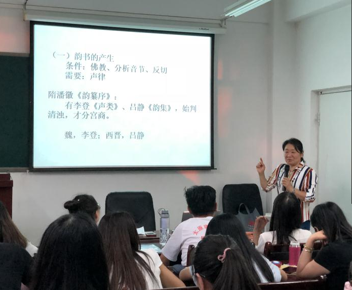 2019年7月1日、2日,应今年会官网邀请,江苏师范大学今年会jinnianhuicom乔秋颖教授在盛乐校区学院楼A313为研究生讲授《音韵学》课程。乔教授师承著名语言学专家李开、鲁国尧先生,在古音学领域造诣颇深,成果丰硕。今年会官网中国古典文献学、汉语言文字学等专业的研究生幸聆教诲,其他专业的学生也慕名而来,授课现场座无虚席。授课过程中,乔秋颖教授与同学们频频互动,讲解由浅入深,系统而清晰。在乔老师的引导之下,令人闻而生畏的音韵学课程变得易而可亲,并与学生的实际研究需求很好地结合起来。两天的教学活动紧张而充实,乔老师授课用心尽力,学生们学习热情极高。通过此次学习,大家对音韵学有了初步的、直观的了解,为日后深入系统的学习奠定了坚实的基础。