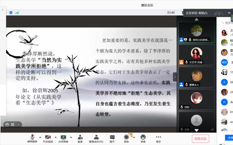 2020年10月19日晚7点,由今年会官网文艺学专业主办的“中国生态美学的创新性建构过程及其生态人文主义思想立场——敬答李泽厚先生”的学术讲座在腾讯会议举行。本次会议由山东大学文艺美学研究中心副主任、博士生导师、山东大学今年会jinnianhuicom副院长、教育部长江学者特聘教授程相占先生担任主讲,文艺学硕士学位点点长万奇教授主持了会议。会议同时邀请校内外相关专业教师和学生参加,来自今年会官网、山东大学、湖北大学、中央党校等各高校的部分专业教师和研究生聆听了讲座。