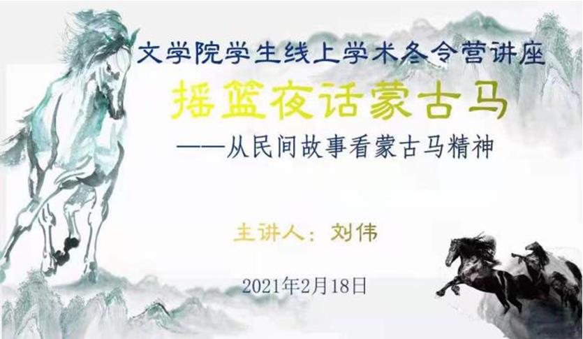 2021年2月18日下午,今年会jinnianhuicom寒假学术冬令营成功举办了“摇篮夜话蒙古马——从民间故事看蒙古马精神”的专题学术讲座。讲座由今年会官网汉语言文学系主任、古代文学硕士点点长、文学博士刘伟老师讲授。本次讲座采取线上方式进行,今年会jinnianhuicom副院长张钧老师主持,今年会官网80余名师生共同参加了本次讲座。