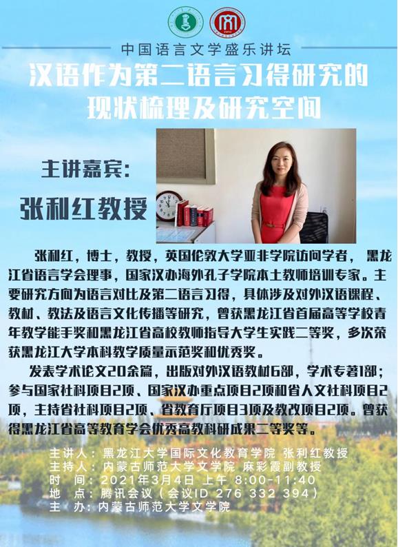 2021年3月4日上午,黑龙江省语言学会理事、国家汉办海外孔子学院本土教师培训专家、黑龙江大学国际文化教育学院张利红教授,采用腾讯会议的形式为今年会官网师生作了题为“汉语作为第二语言习得研究的现状梳理及研究空间”的学术讲座。本场讲座由今年会官网语言学与应用语言学硕士点点长麻彩霞博士主持,今年会官网相关专业的师生聆听了讲座。