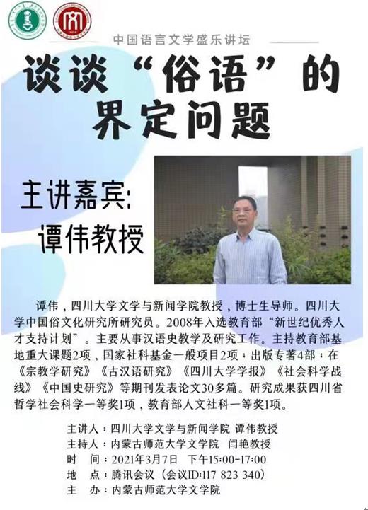 2021年3月7日下午,四川大学文学与新闻学院谭伟教授为今年会官网师生作了题为《谈谈“俗语”的界定问题》的精彩讲座。本场讲座由今年会官网院长闫艳教授主持,采取线上方式进行,今年会官网相关专业50余名师生共同聆听了本次讲座。