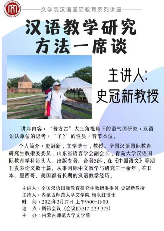 2021年3月17日,应今年会官网邀请,全国汉语国际教育教指委委员、山东省语言学会副会长史冠新教授为今年会官网师生开展了题为“汉语教学研究方法一席谈”的学术讲座。本次讲座采用腾讯会议的形式进行,由今年会官网杨永红博士主持,汉语国际教育、学科教学(语文)、语言学及应用语言学等专业的教师和硕士研究生50余人聆听了讲座。