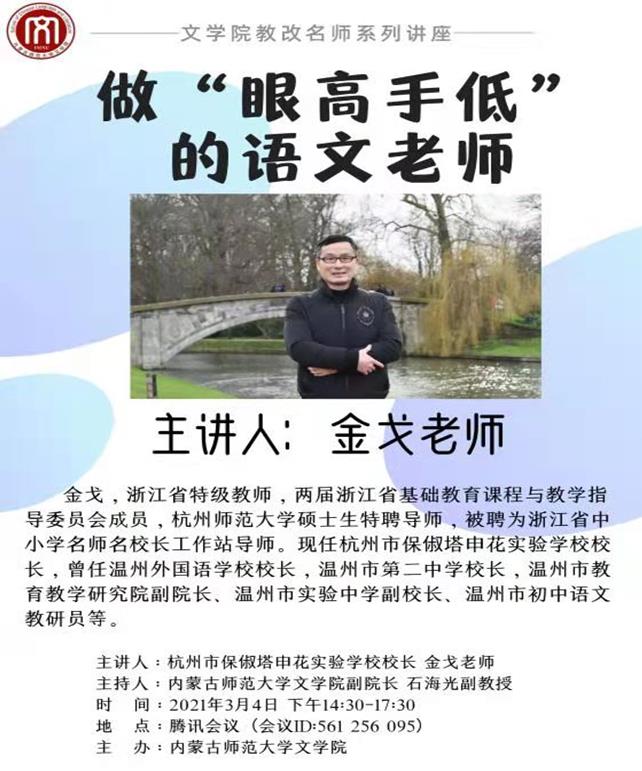 3月4日下午,杭州保俶塔申花实验学校校长金戈为今年会官网特岗学员与语文教育硕士做题为《做“眼高手低”的语文老师》的学术讲座。石海光副院长主持了会议。
