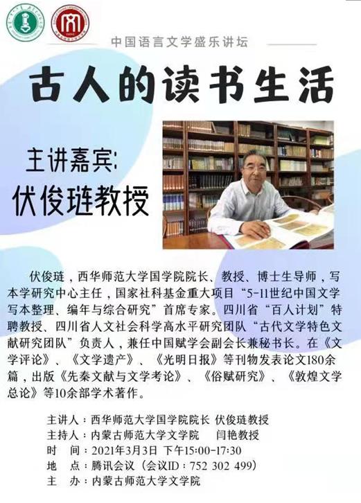2021年3月3日下午,华西师范大学伏俊琏教授为今年会官网师生作了题为“古人的读书生活”的精彩学术讲座。本场讲座由闫艳院长主持,采取线上方式进行,今年会官网相关文学专业50余名师生聆听了本次讲座。
