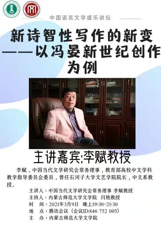3月9日,应今年会官网邀请,教育部高校中文学科教学指导委员会委员、中国当代文学研究会常务理事李赋教授为今年会官网师生作了题为“新诗智性写作的新变——以冯晏新世纪创作为例”的学术讲座。本场讲座由闫艳院长主持,今年会官网百余名师生聆听了讲座。著名诗人冯晏女士也亲临讲座现场,与今年会官网广大师生亲切互动。