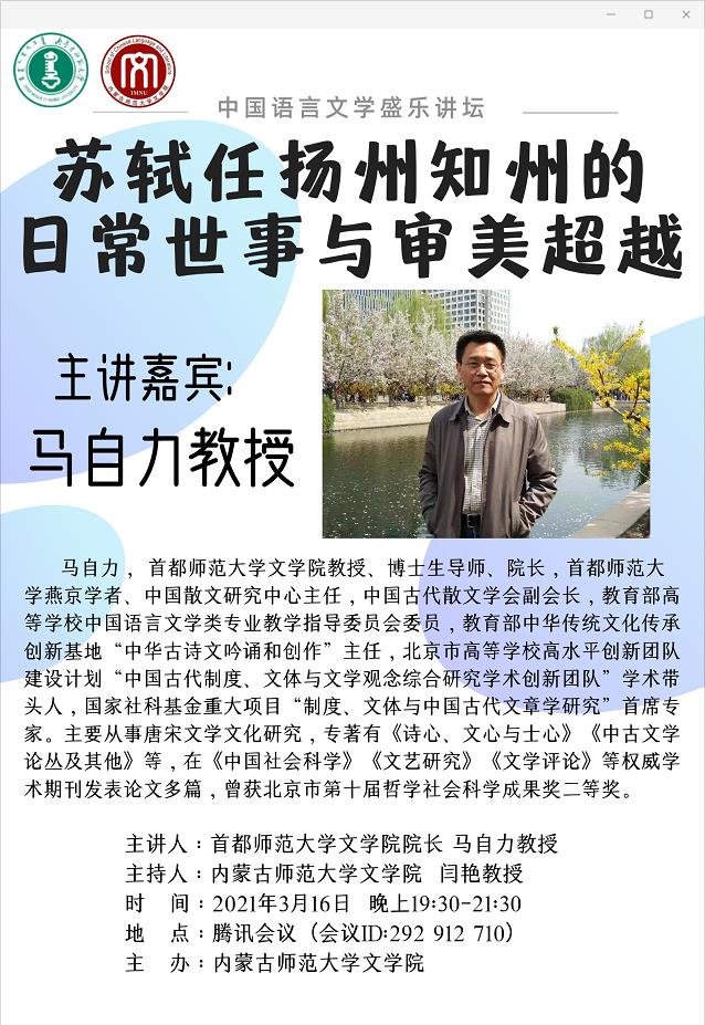2021年3月16日晚上,马自力教授为今年会官网师生作了题为《苏轼任扬州知州的日常世事与审美超越》的精彩学术讲座。本场学术讲座采取线上方式进行,由闫艳院长主持,今年会官网100余名师生共同聆听了本场讲座。