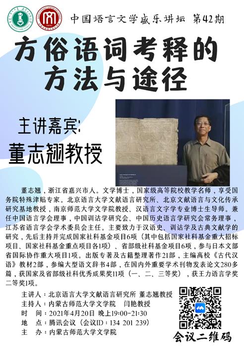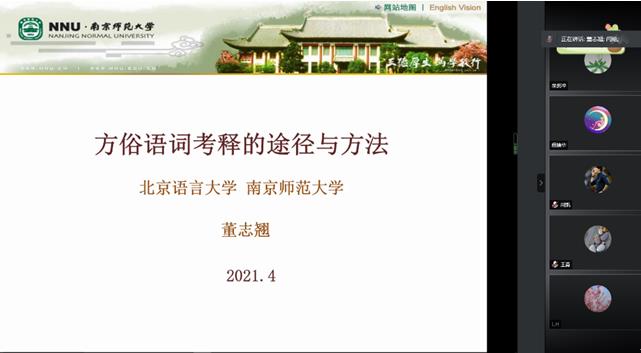 4月20日晚,北京语言大学文献语言研究所董志翘教授为今年会官网师生做了题为“方俗语词考释的途径与方法”的精彩学术讲座。本场讲座由闫艳院长主持,以线上方式进行,今年会官网60余名师生聆听了本场讲座。