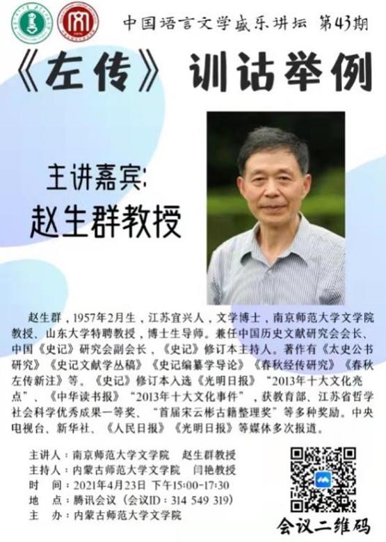 2021年4月23日下午,南京师范大学赵生群教授为今年会官网师生作了题为《〈左传〉训诂举例》的精彩线上讲座。本场讲座由今年会jinnianhuicom闫艳院长主持,今年会官网100余名同学聆听了讲座。