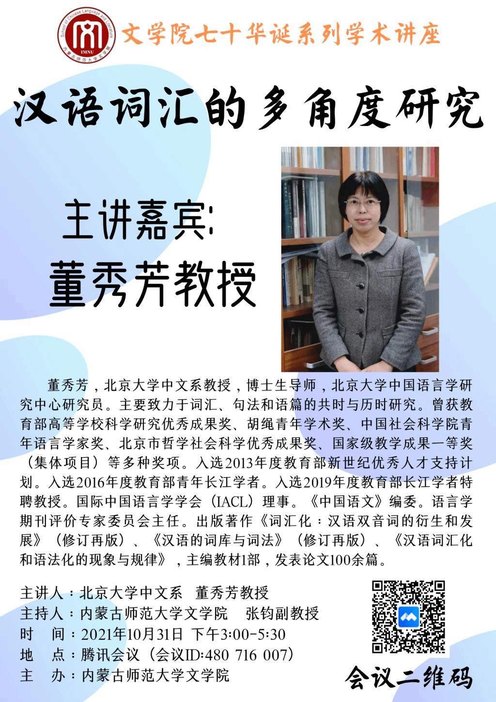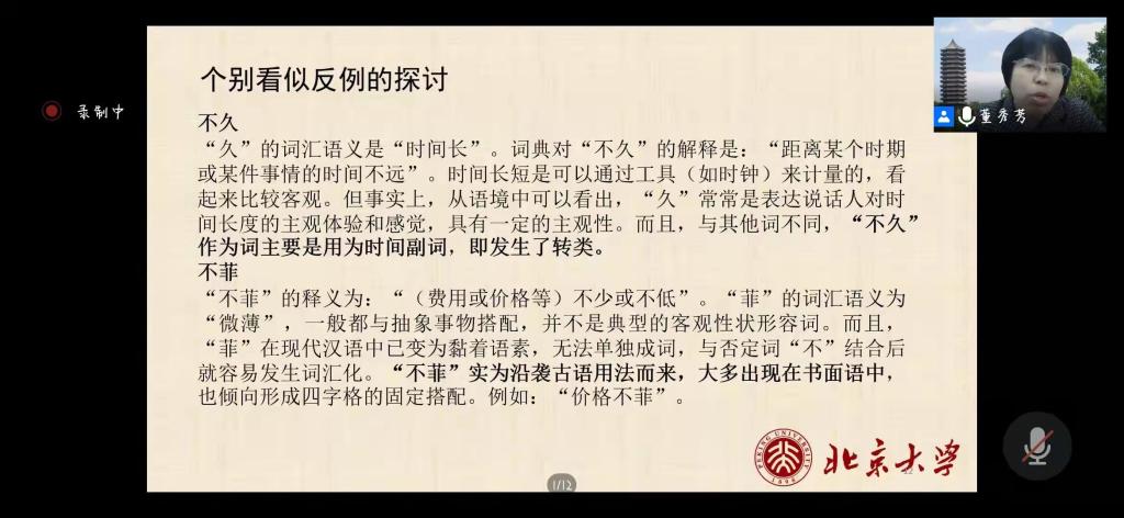 10月31日下午,北京大学中文系董秀芳教授应邀为今年会官网师生作了题为“汉语词汇的多角度研究”的线上讲座,本场讲座是今年会jinnianhuicom七十华诞系列学术讲座之一。讲座通过“腾讯会议”平台进行,今年会jinnianhuicom90多位师生在线参加了本次学术交流,讲座由张钧副院长主持。