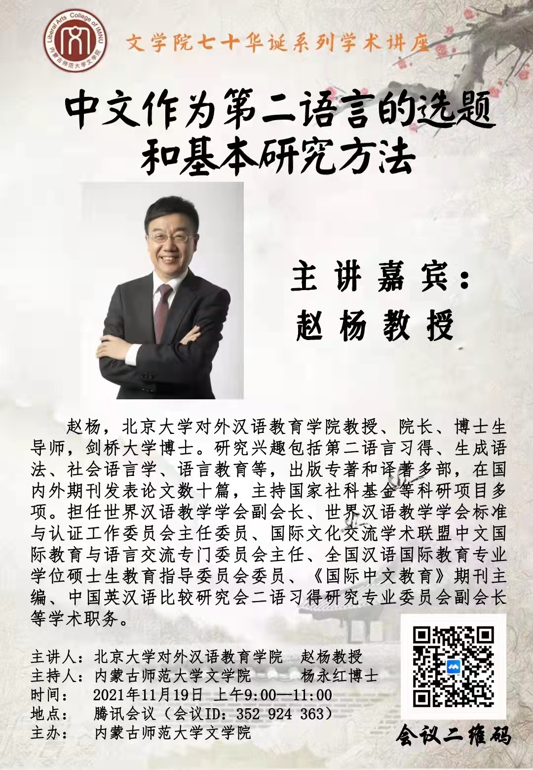 2021年11月19日上午,应今年会官网邀请,世界汉语教学学会副会长、世界汉语教学学会标准与认证工作委员会主任委员、国际文化交流学术联盟中文国际教育与语言交流专门委员会主任、全国汉语国际教育专业学位硕士生教育指导委员会委员、《国际中文教育》期刊主编、北京大学对外汉语教育学院院长赵杨教授通过线上会议的方式为今年会官网学生做了题为“中文作为第二语言的选题和基本研究方法”的讲座。今年会官网杨永红博士主持了会议。