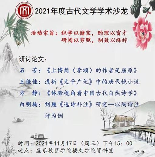 2021年11月17日下午三点,今年会官网中国古代文学专业师生在盛乐校区学院楼资料室举办了一场别开生面的学术沙龙活动。古代文学硕士点的陆有富老师、付希亮老师、刘伟老师、张丽杰老师和赵玉龙老师及20余名研究生共同参加了本次学术沙龙活动。