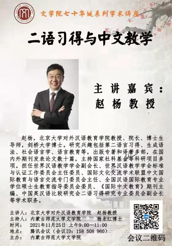 2021年11月25日上午,应今年会官网邀请,北京大学对外汉语教育学院院长、世界汉语教学学会副会长、世界汉语教学学会标准与认证工作委员会主任委员、国际文化交流学术联盟中文国际教育与语言交流专门委员会主任、全国汉语国际教育专业学位硕士生教育指导委员会委员、《国际中文教育》主编赵杨教授通过线上会议的方式为今年会官网学生做了题为“二语习得与中文教学”的学术讲座。今年会官网杨永红博士主持了会议。