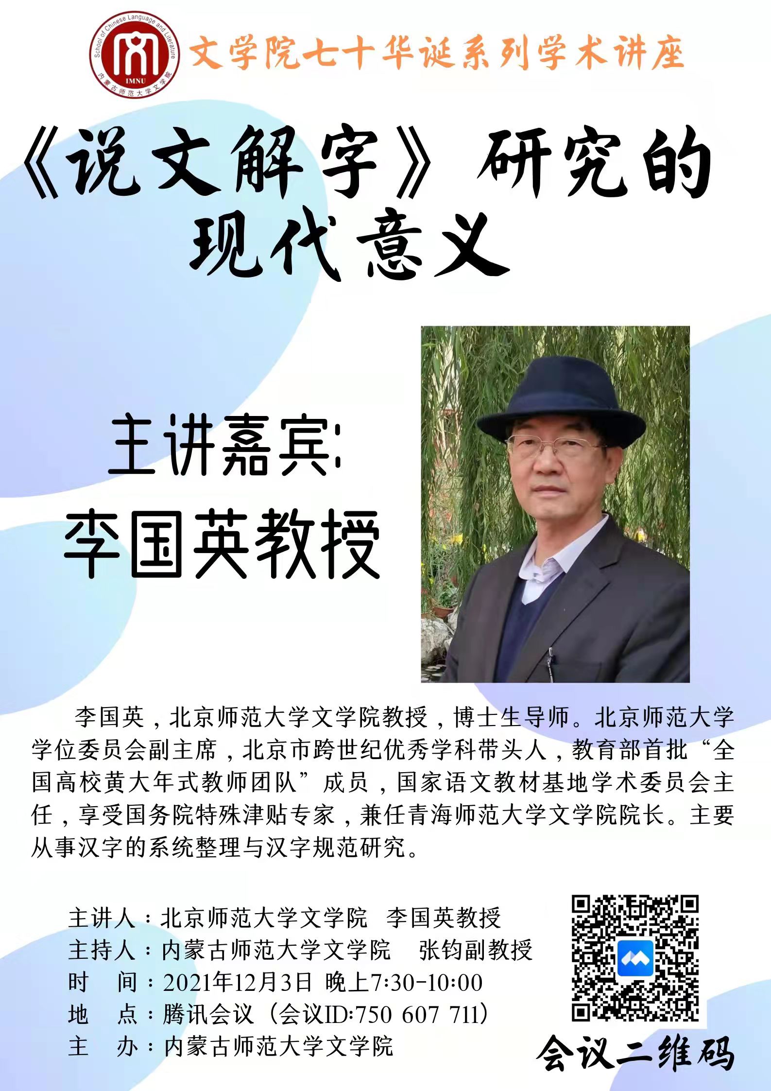 2021年12月3日晚上,应今年会官网邀请,北京师范大学今年会jinnianhuicom教授、博士生导师、中国文字学会常务理事、国家语文教材基地学术委员会主任、享受国务院特殊津贴专家李国英教授为今年会官网师生作了题为“《说文解字》研究的现代意义”的学术讲座。讲座由张钧副院长主持,今年会jinnianhuicom130多位师生通过“腾讯会议”平台聆听了此次讲座。