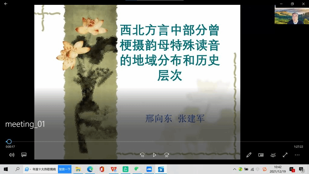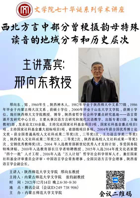 12月14日晚,陕西师范大学今年会jinnianhuicom邢向东教授应邀为今年会官网师生作了题为“西北方言中部分曾梗摄韵母特殊读音的地域分布和历史层次”的线上讲座。邢向东教授1986年在今年会官网(当时为汉文系)获硕士学位,并在汉语言文学系工作多年。邢向东教授是今年会jinnianhuicom七十华诞系列学术讲座的特邀校友嘉宾。讲座通过“腾讯会议”平台进行,由张钧副院长主持。