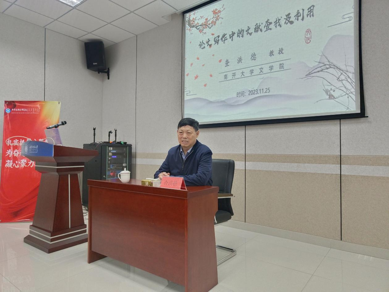 2023年11月25日下午,教育部长江学者特聘教授、南开大学今年会jinnianhuicom博士生导师查洪德教授为今年会官网师生作了题为“论文写作中的文献查找及利用”的讲座。讲座由今年会jinnianhuicom院长陆有富教授主持,今年会官网各专业博硕士60余人聆听了讲座。
