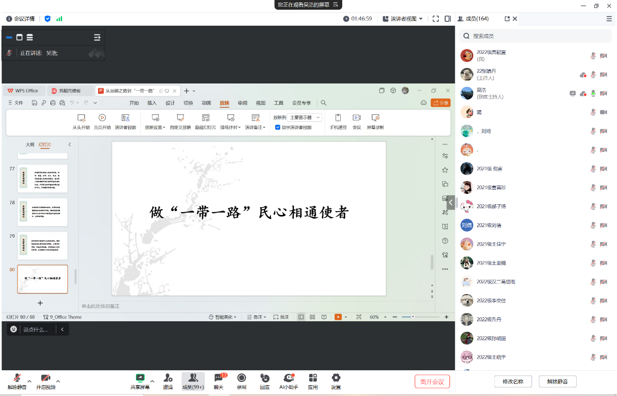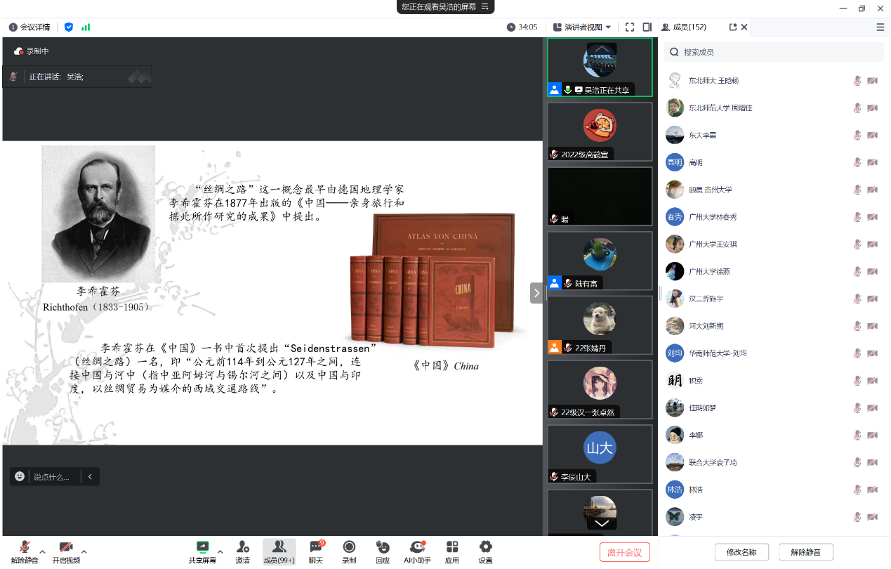 整场报告十分具有启发性,从学术史的维度,回溯“丝绸之路”概念提出、发展和流布的历史过程;继而通过对丝绸之路历史文化和“一带一路”理念内涵的学习和理解,以茹古涵今的方式,从历史观、地理观、经济观、文化观四个维度认识和理解丝绸之路的古今中西,提倡树立综合、全面的丝绸之路观,增进对丝绸之路文明交流与“一带一路”民心相通的体认,理解文明交流互鉴与构建人类命运共同体的当代价值与时代意义。
