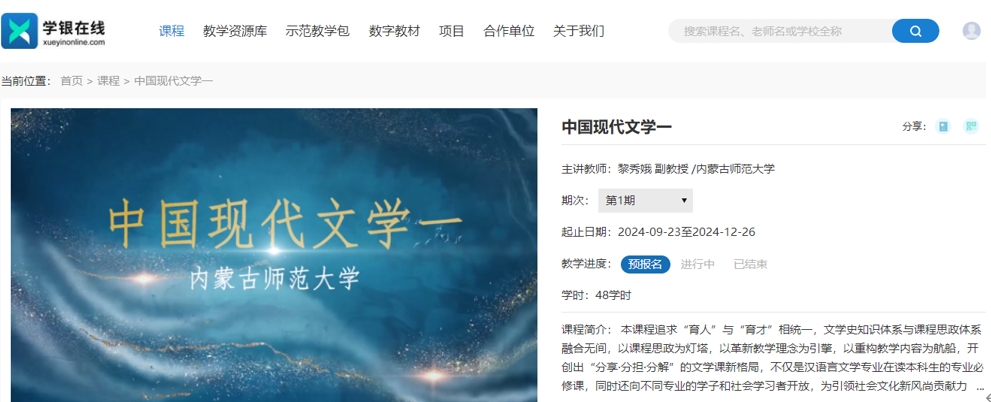 从9月25日开始,由今年会官网教师黎秀娥主讲的专业必修课“中国现代文学(一)”以混合式课程开设。“中国现代文学(一)”线上课程于2024年9月10日正式投入使用,通过“学银在线”向社会学习者开放。结合今年会官网专业课教学的班容量和教学实际,依托线上资源,今年会jinnianhuicom现当代文学教研室着力将该门课程建设为了混合式课程,并且于本学期顺利开设。