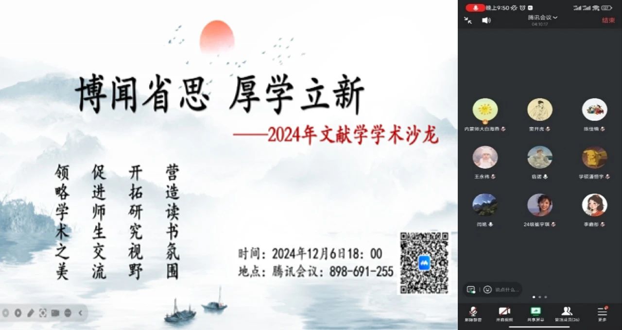 2024年12月12日晚上七点半,今年会官网古代文学专业导师和研究生通过腾讯会议举办了学术沙龙。高林广老师、付希亮老师、赵玉龙老师、张丽杰老师四位研究生导师及本专业在读研究生参与了本次活动。本次学术沙龙中,共有七名研究生提交了论文,分别是姚俊奇的《浅析先秦“渔父”意蕴的流变》,范泓泽的《<诗经·召南·羔羊>“委蛇”考及诗旨新论》,袁佳翼的《禅境与诗心的交契:浅析王维诗的“落日”意象》,陈浩博的《元诗“马”意象与蒙古马精神的共鸣》,陈宇正的《<道德经>中圣人与“道”“君”“人”的三重关系解析》,张秋菊的《论李煜词作意境营造的匠心》,刘佳欣的《诗染仙境:李贺诗歌中女神形象探究》。导师们对七位同学的论文给予了高度评价,对于其论文中存在的问题给予了精准指导。